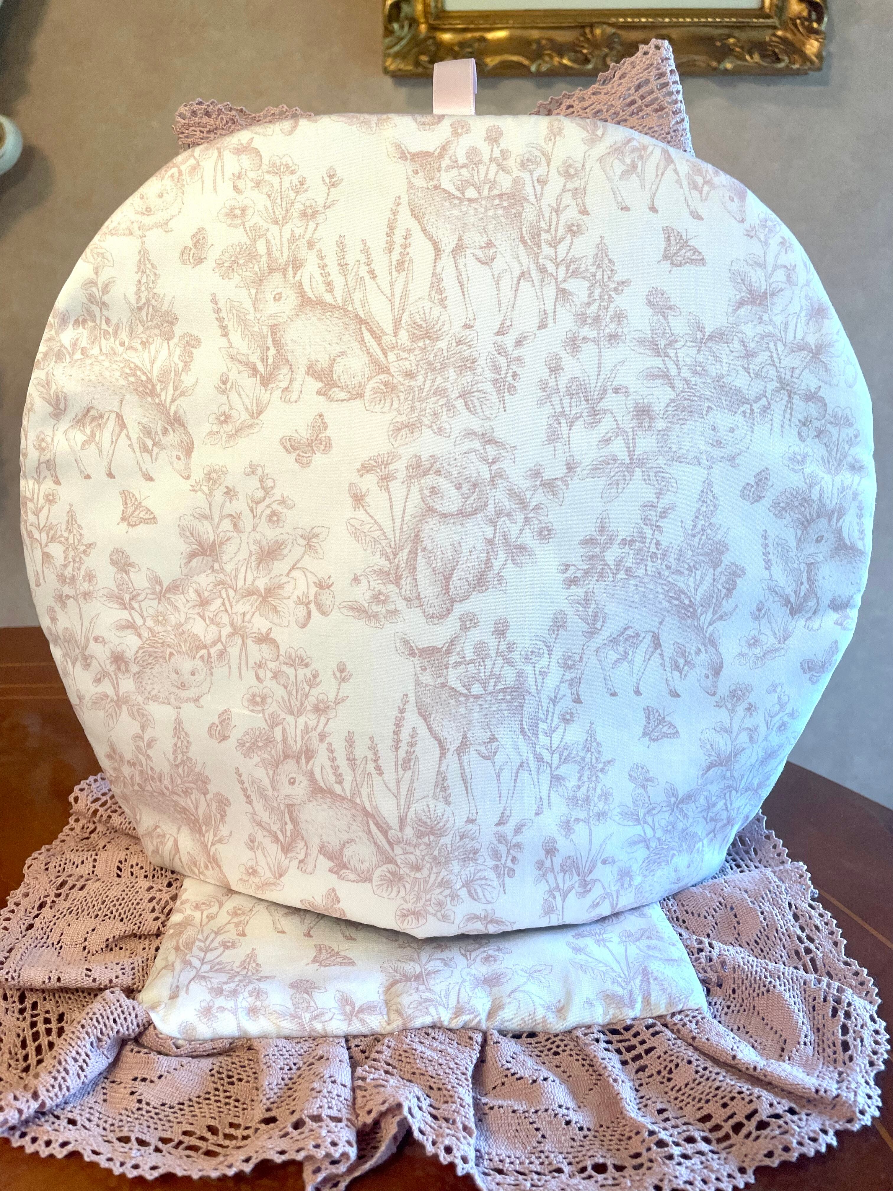 トイプードルやうさぎ柄が可愛いトワルドジュイのコットンサテン生地を使用し、上質なフローラルテープやレースも贅沢にあしらった、 ティータイムを特別にしてくれるティーコゼです。 同柄のティーマットと合わせると、よりスペシャルに♡