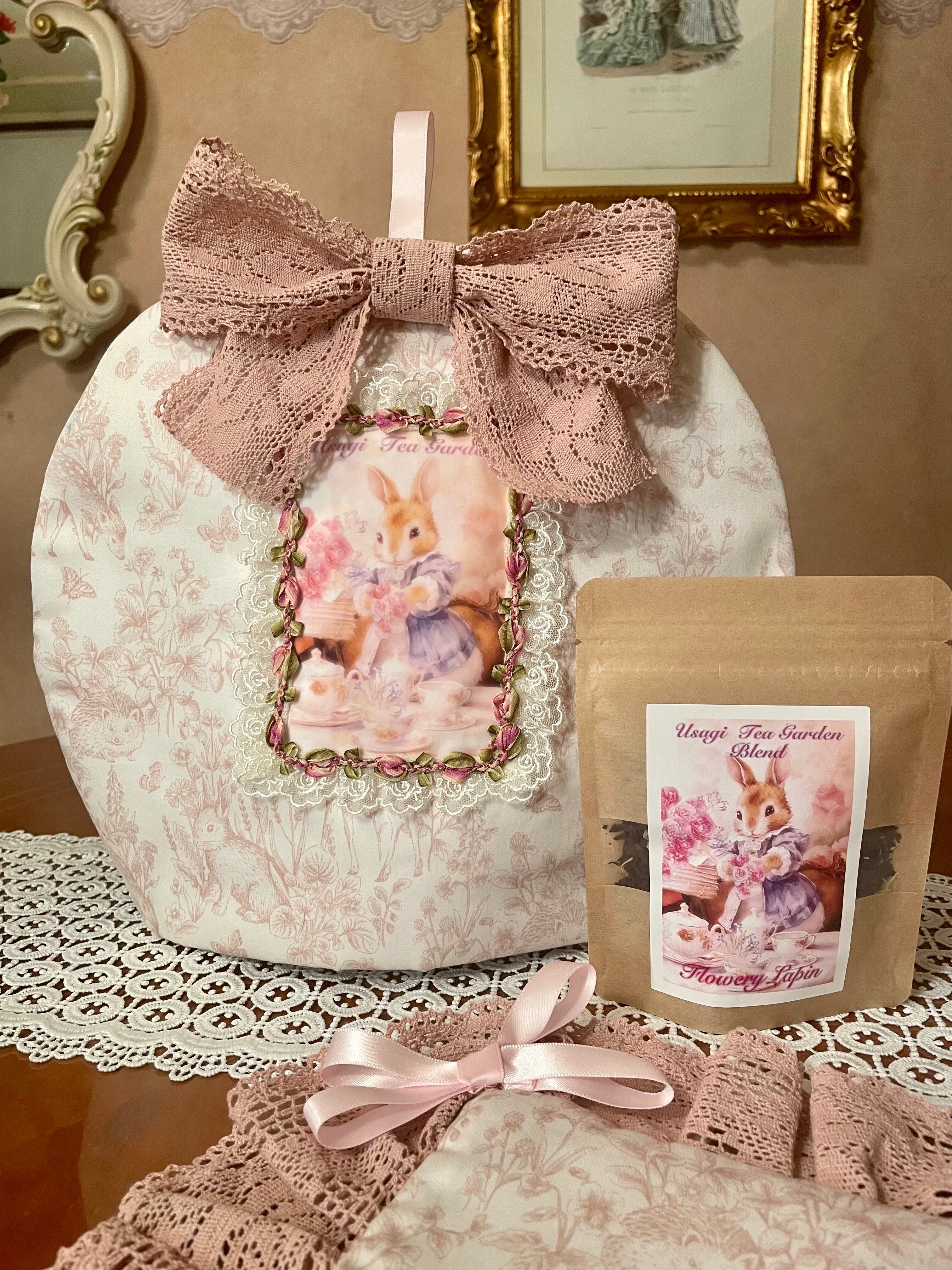 オリジナルブレンドティー「フラワリーラパン」のパッケージイラストの、レディバニーのティーコゼーをハンドメイドしました^_^